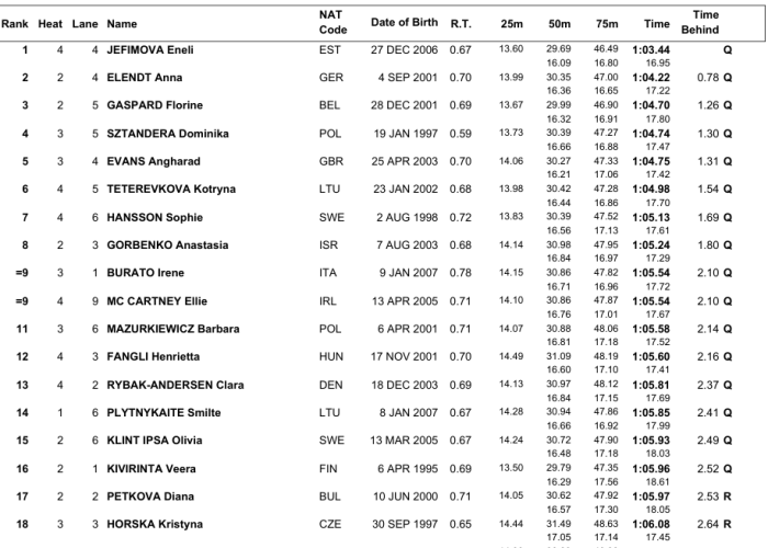 Eneli Jefimova set a swift pace in pursuit of the defence of her title as she went within 0.03 of her Estonian record in 1:03.44. Anna Elendt, winner of the world title in Singapore, was next home in 1:04.22 followed by Florine Gaspard (1:04.70),
