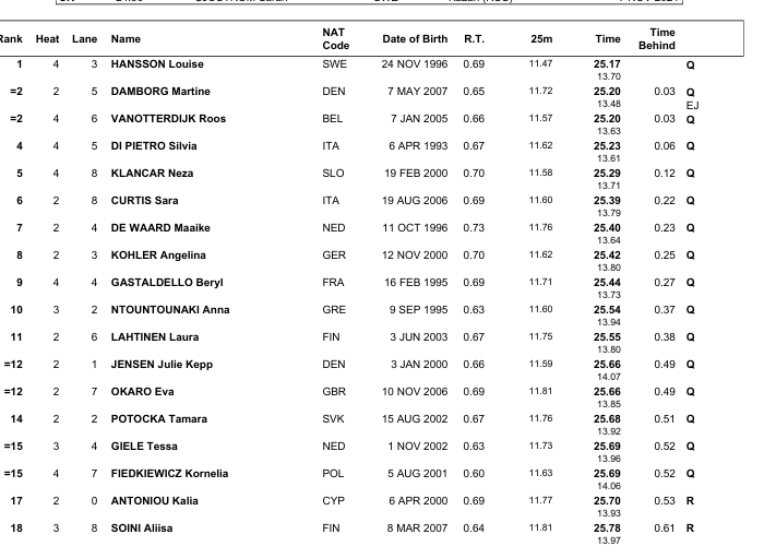 Louise Hansson led the way in 25.17 with Martine Damborg and Roos Vanotterdijk both clocking 25.20. It was a european junior record for the former who shaved 0.01 from her own mark set last year in Copenhagen.