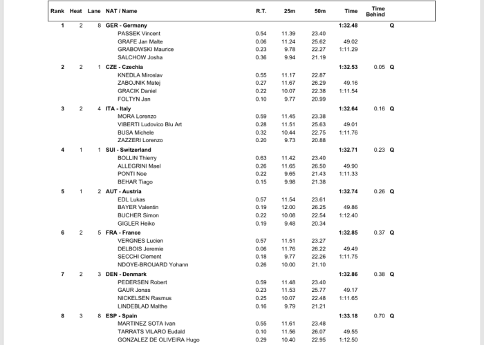 The top eight were separated by 0.70secs with the German quartet booking lane four for the final in 1:32.48 followed by Czechia (1:32.53) and Italy (1:32.64). Noè Ponti split a 21.43 fly leg as Switzerland progressed fourth in 1:32.71 with Heiko Gigler going 20.34 on anchor as Austria advanced in 1:32.74. Yohann Ndoye Brouard was on the freestyle leg for France who were next through.