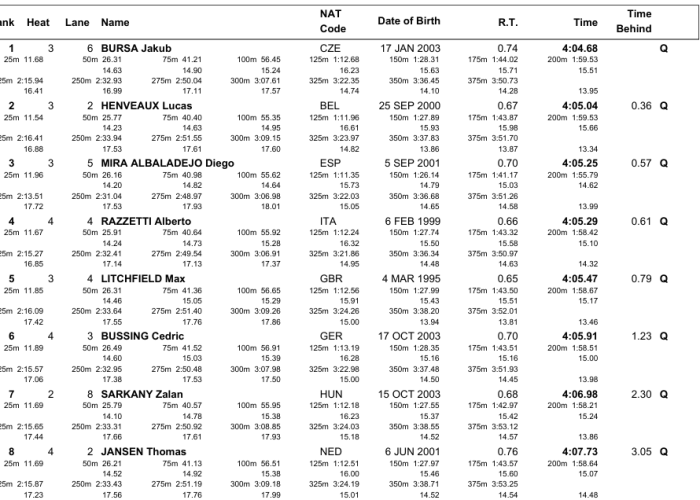 Jakub Bursa led the way in 4:04.68 followed by Lucas Henveaux who returned from his 800 free silver on Saturday evening to book lane five in 4:05.04, followed by Spain’s Diego Mira Albaladejo (4:05.24). Reigning champion Alberto Razzetti (4:05.29) and 2019 gold medallist Max Litchfield (4:05.47) also advanced. Zalan Sarkany, fresh from his 800 title, swam a 13-second PB to post 4:06.98 for seventh.