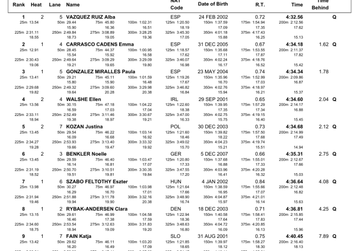 The two-per-nation rule intervened in the very first race of the session where Spanish women filled the top three slots. Alba Vasquez Ruiz topped the field by a clear margin as the only woman to go inside 4:33 in 4:32.56. She was followed by teammates Emma Carrasco Cadens (4:34.18) and Paula Gonzalez Miralles (4:34.34) with the latter missing out by 0.16. Ellen Walshe of Ireland – who won silver in the 200IM on Saturday – was third through in 4:34.60.