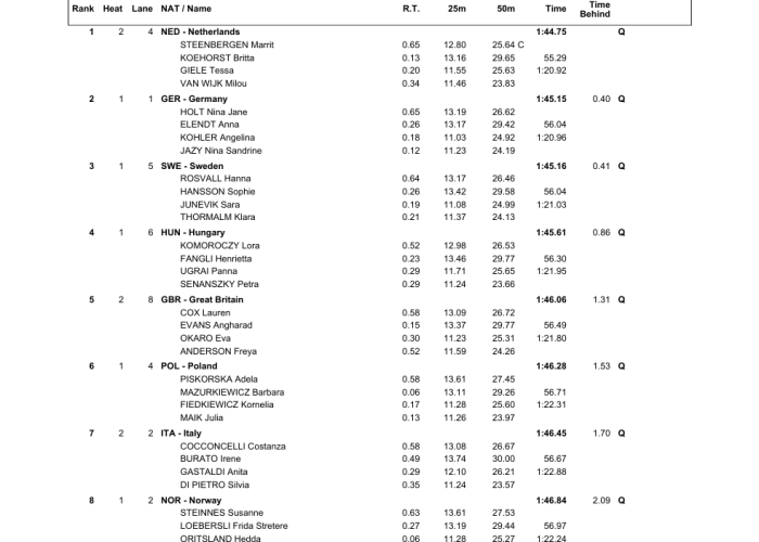 Steenbergen got the Netherlands quartet off to a flying start as they topped prelims in 1:44.75 followed by Germany (1:45.15) – featuring a 24.92 fly leg from Angelina Kohler – and reigning champions Sweden (1:45.16). Petra Senanszky split a 23.66 anchor leg to propel Hungary through in fourth followed by Great Britain., Poland, Italy – thanks to a 23.57 anchor from Silvia di Pietro – and Norway.