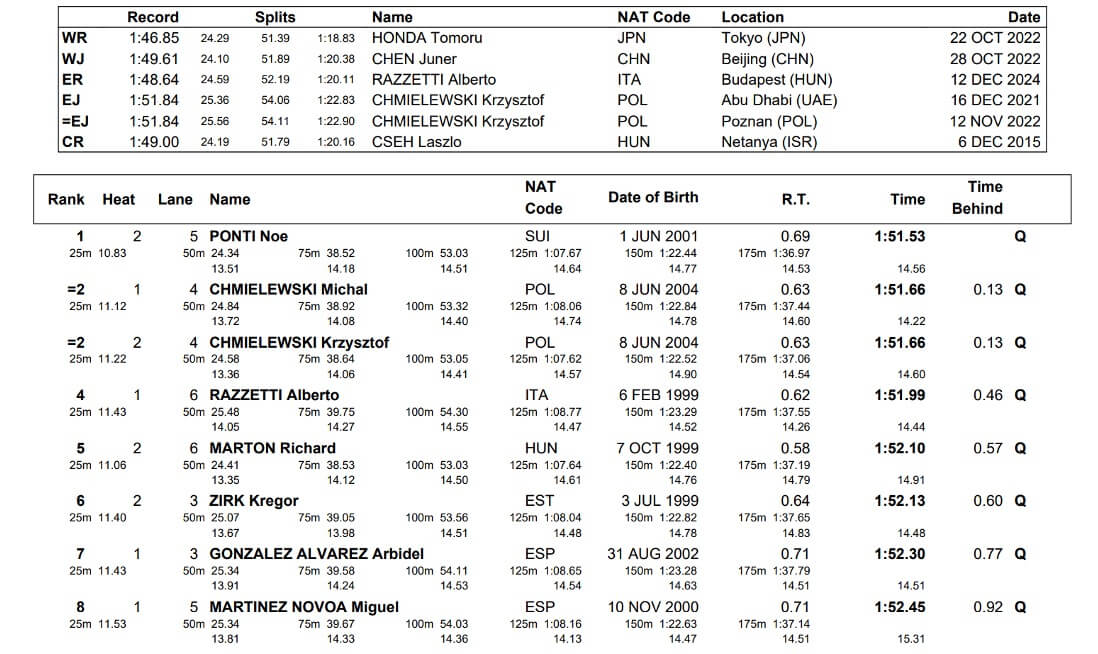Switzerland’s Noe Ponti will seek his third medal in as many butterfly events when the final of the 200 fly is held. Ponti already won gold in the distance and silver in the 100 distance. The Swiss star earned the top seed for the 200 fly when he raced to a mark of 1:51.53 in the semifinals. Tying for the second spot were Polish twins Michal Chmielewski and Krzysztof Chmielewski, who had matching swims of 1:51.66. Italian Alberto Razzetti is lurking in fourth after a time of 1:51.99.