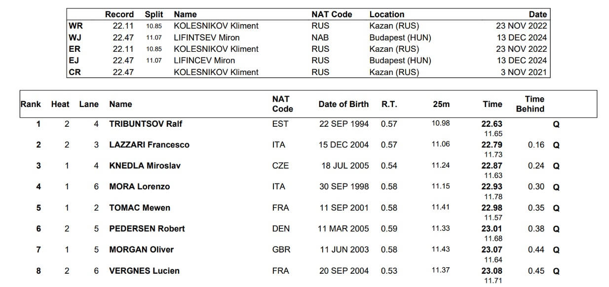 Estonia’s Ralf Tribuntsov will be the No. 1 seed in the final of the 50 backstroke following a 22.63 performance in the semifinals. Tribuntsov finished ahead of Italian Francesco Lazzari, who was second-fastest in the morning behind a time of 22.79. Next was the Czech Republic’s Miroslav Knedla, who touched the wall in 22.87.