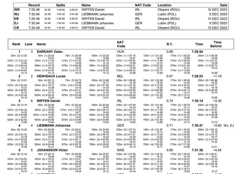 Germany’s Johannes Liebmann, who set a world junior record in the prelims, lowered that standard even further in the final. En route to fourth place, Liebmann finished in 7:30.47, which cut .47 off his day-old record.