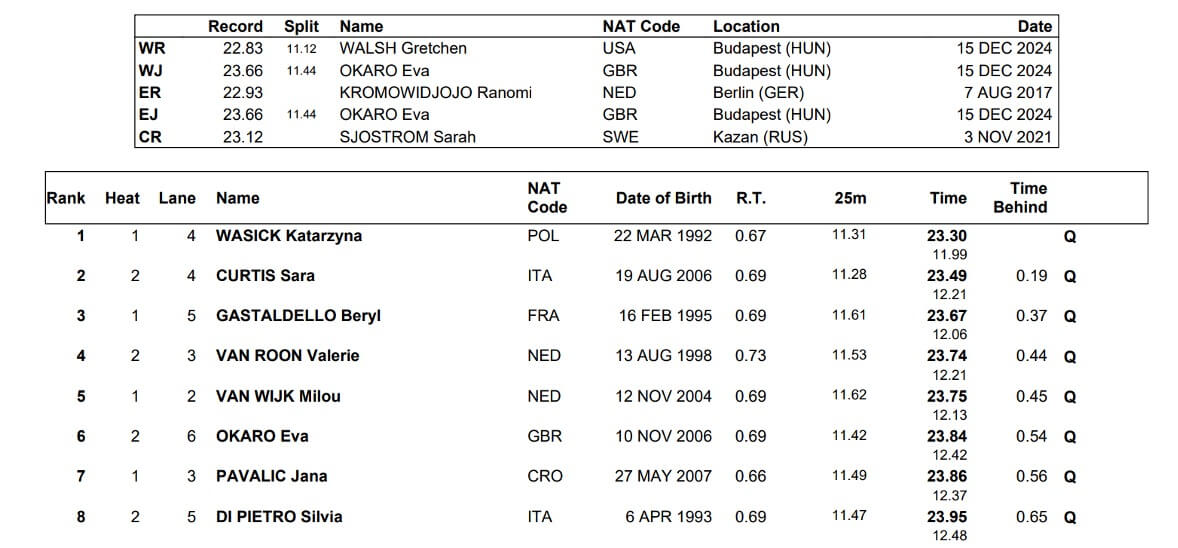 Poland’s Kasia Wasick and Italian Sara Curtis have each contributed impressive 50 freestyle anchor legs during the European Championships, and now they’ll duel in the final of the 50 free. Wasick grabbed the top seed for the final, as her mark of 23.30 was quicker than the 23.49 of Curtis. They were followed in the third position by France’s Beryl Gastaldello, who was timed in 23.67.