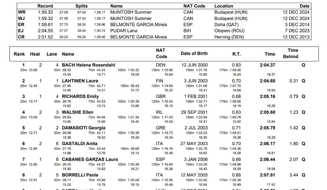 Denmark’s Helena Bach will race out of Lane Four in the final of the 200 butterfly, thanks to a prelims mark of 2:04.37. Bach earned the No. 1 seed for Sunday night by .31, the margin to Finland’s Laura Lahtinen (2:04.68). Great Britain’s Emily Richards (2:05.16) and Ireland’s Ellen Walshe (2:05.60) moved on as the third and fourth seeds, Walshe not long after winning silver in the 200 IM.