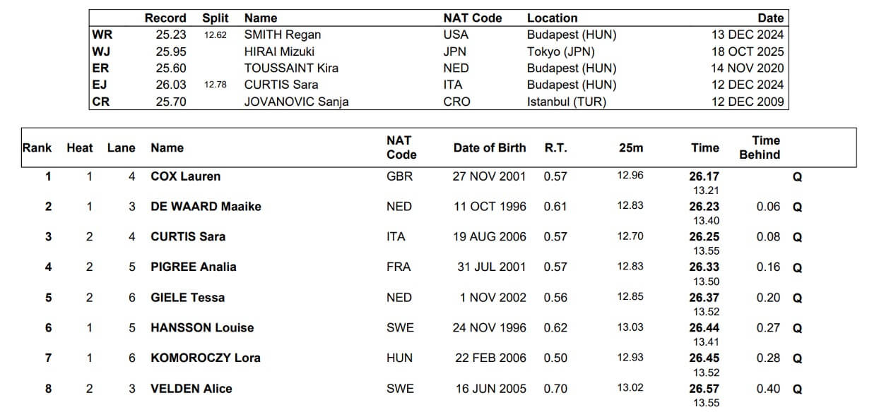 Great Britain’s Lauren Cox secured the top seed for the championship heat of the 50 backstroke. Cox raced to a time of 26.17 in the semifinals, which was .06 faster than the 26.23 of Dutchwoman Maaike de Waard. Italian Sara Curtis qualified for her second final in the session, going 26.25 for third. Curtis earlier grabbed the No. 2 seed for the final of the 50 freestyle.