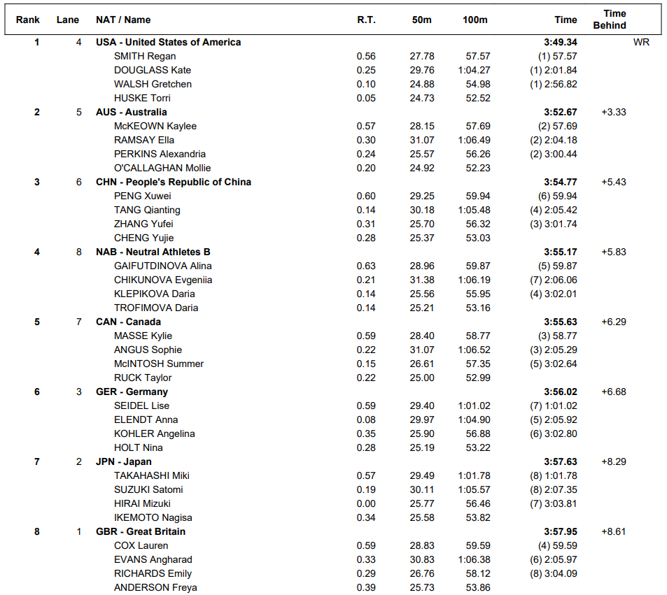 Just missing the podium was the team of Neutral Athletes, despite Daria Klepikova providing the only sub-56 butterfly split aside from Walsh. Canada was fifth in 3:55.63, with Summer McIntosh following up her busy schedule with a 57.35 butterfly leg. Sixth-place Germany got a 1:04.90 split from Anna Elendt, the 100-meter world champion, on the breaststroke leg.