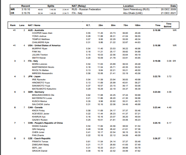 Australia and the USA took 0.18 off the previous WR of 3:19.16 held by Russia since the supersuit era with Italy’s time of 3:19.06 a European mark.