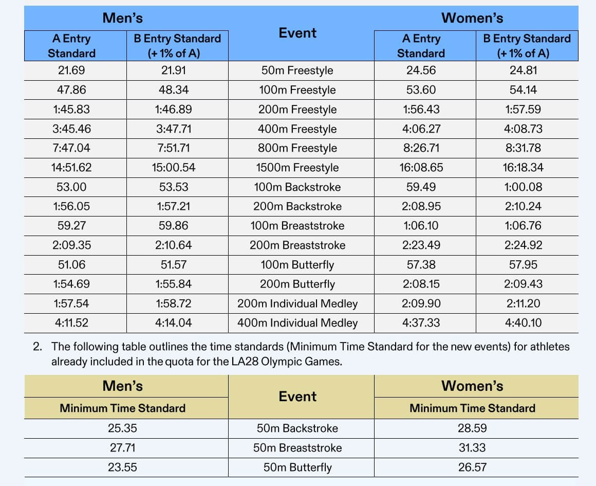 Qualification for the Los Angeles 2028 Olympics is a little different, with direct qualification in the stroke 50s and a reduction of 16 automatically qualified relays to 12.