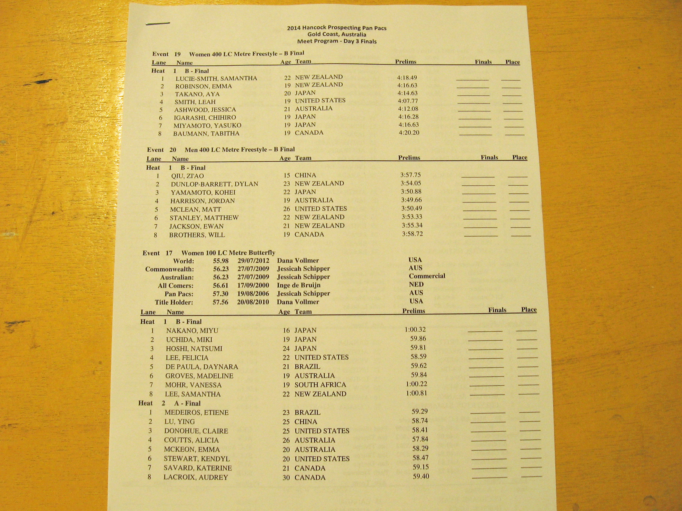 Alicia Coutts and Emma McKeon will look to give Australia a 1-2 finish in the women’s 100 fly tonight, while Missy Franklin and Elizabeth Beisel will try to give the Americans a sweep of the top of the podium in the women’s 200 back. Belinda Hocking of Australia is the top seed and will be a tough challenger.