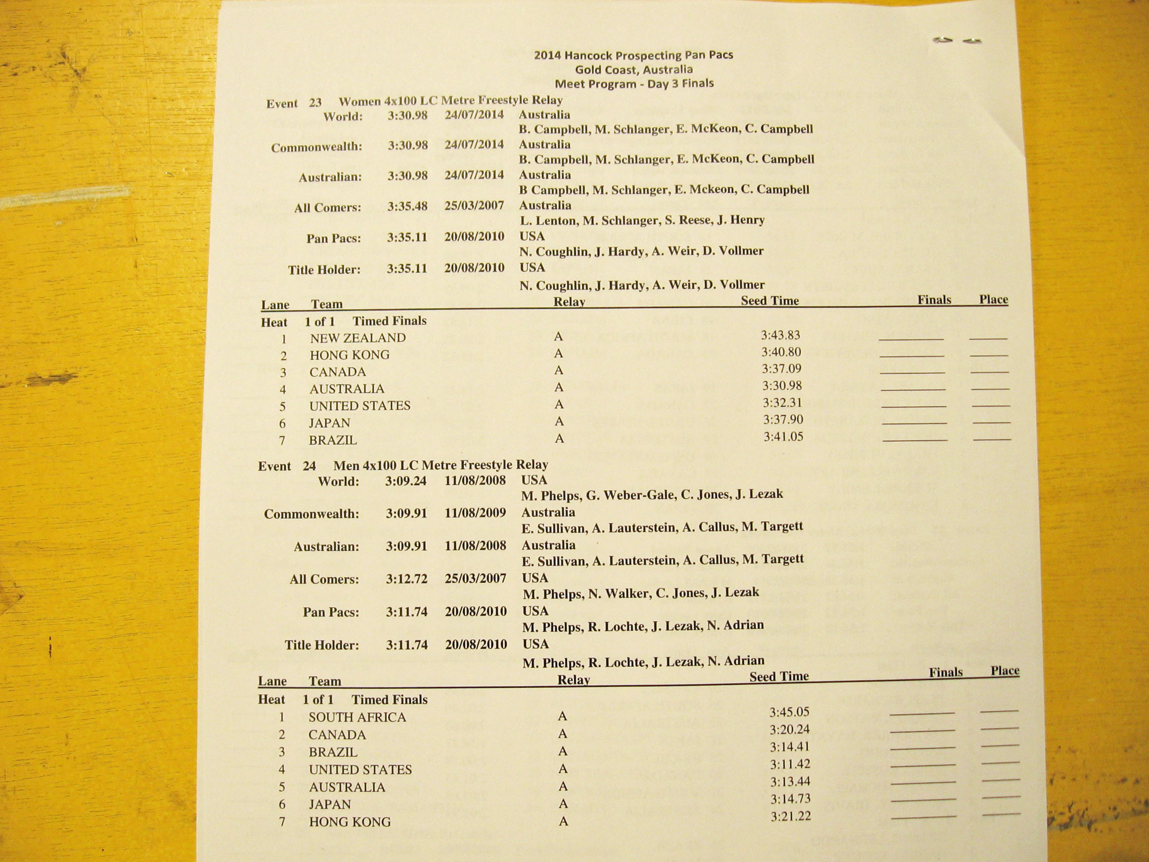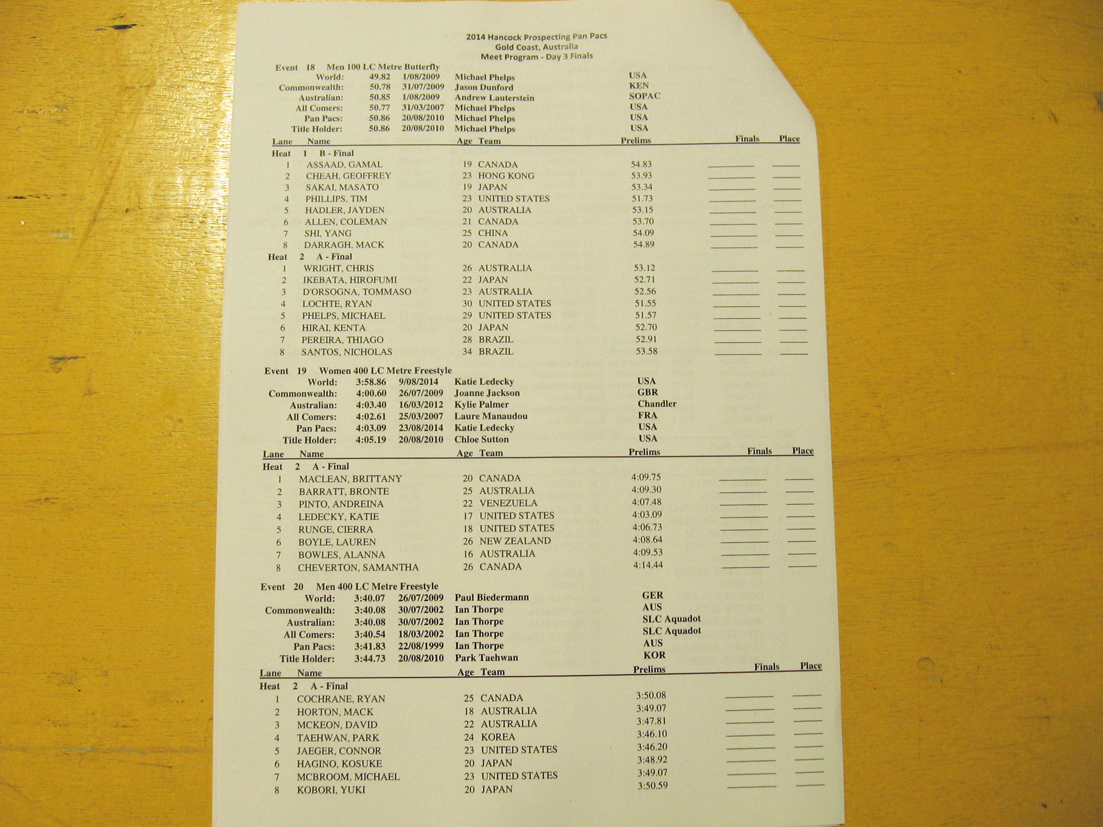 GOLD COAST, Australia, August 23. THE heat sheets for tonight’s competition at the Pan Pacific championships show some exciting lane placements that will produce some thrilling results in all the championship final events.