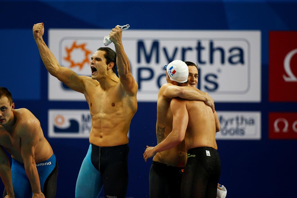 France reclaimed its 2010 world title with a meet-record performance in the men’s 400-meter free relay.