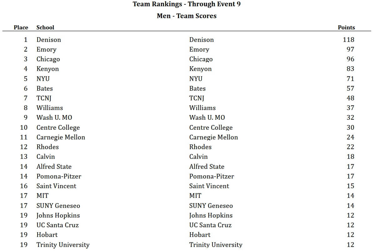 NYU has two B finalists, led by ninth-place Sebastien Wegner. Denison has just Luke Swiggett in the B final.