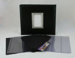 The Open Style Album (see image at right) has the estimated capacity to hold 80 Awards plus team photos and programs. The album is made of smooth black leather-like material with white stitching along the outside edges and a cloth interior. The Silver frame on the front holds a 4×6 photo. The product design is easy, versatile and the permanent organizing solution!