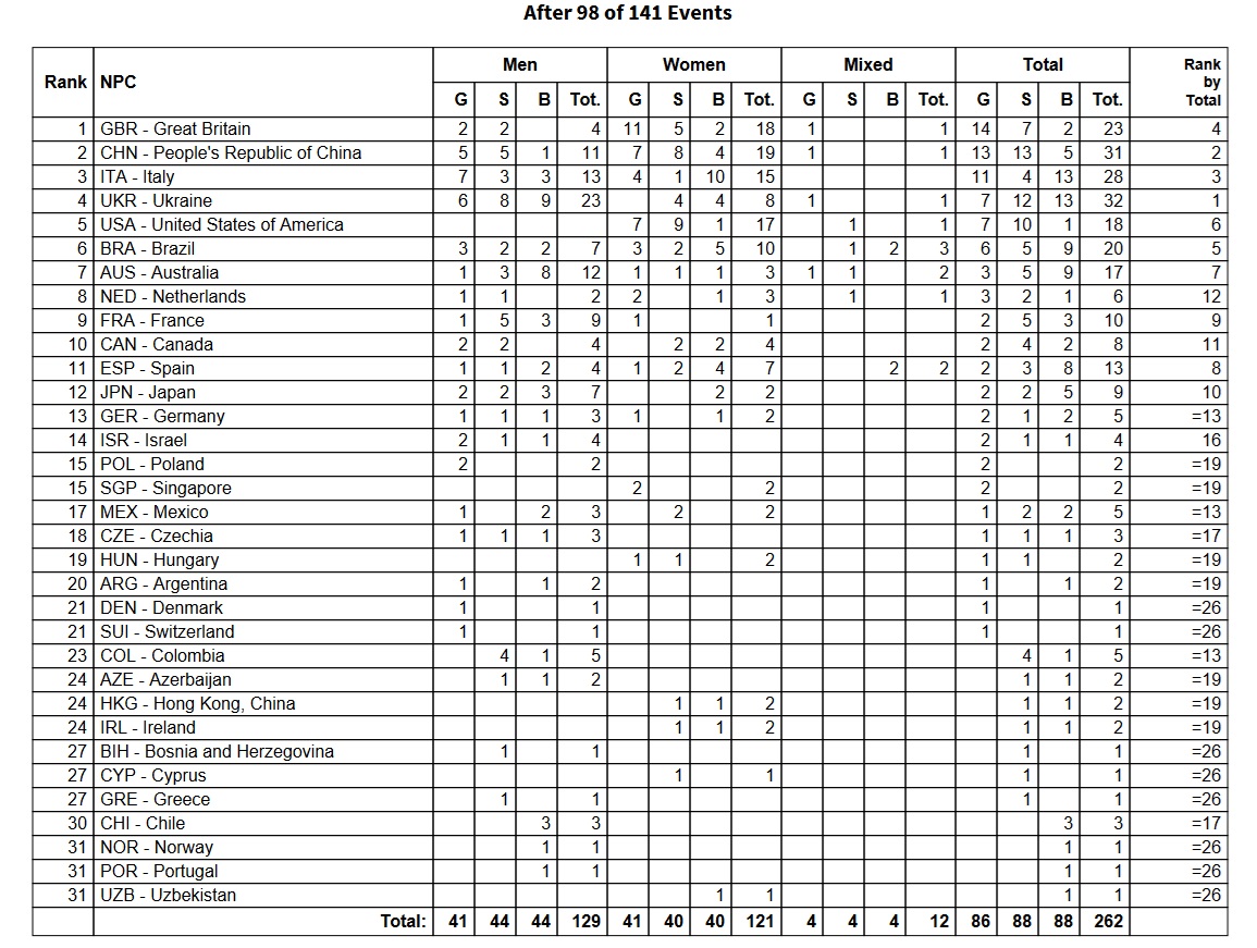 Yaroslav Denysenko finished a historic evening by anchoring Ukraine to gold in the mixed relay. The squad went 3:53.84, with the team of Maryna Piddubna (S11), Oleksii Virchenko (S13), Anna Stetsenko (S12) and the S12 Denysenko off the end. The Ukrainians were sixth after 100 meters and second at the final exchange before Denysenko blasted home in 52.75. It’s faster than the 53.11 he used to win the individual event earlier in the session and took Ukraine from 3.5 seconds back to a winning margin of 3.10 over Brazil.