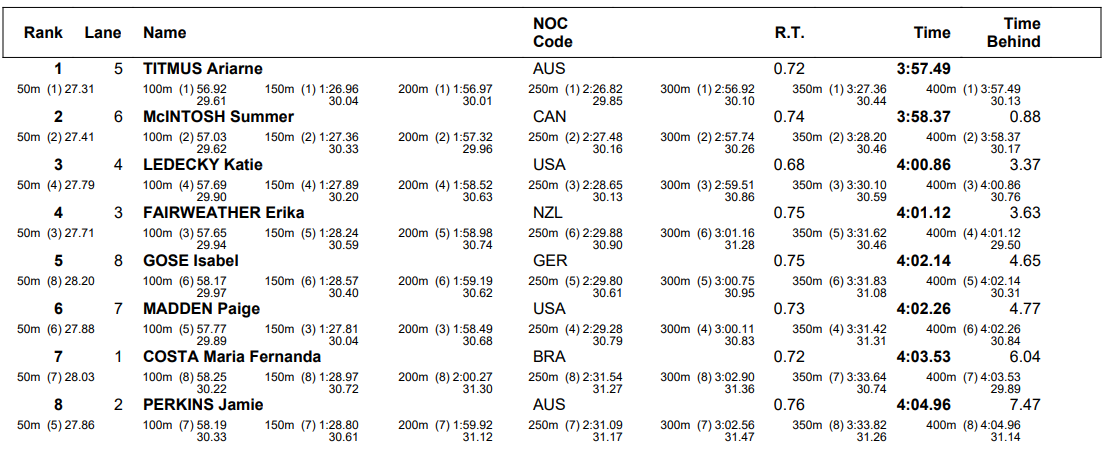 Have to say I expected all medallists to be under 4min. But both Titmus and Ledecky (pronounced Leh-Dets-Skee) were a couple seconds slower than respective Trials.