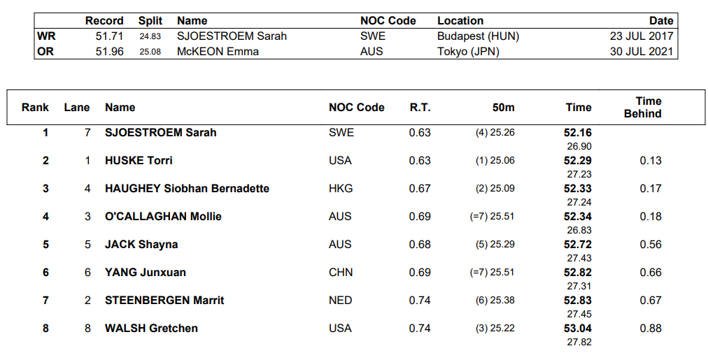 Sjostrom, Huske and Haughey spoiled the Aussies party, with Shayna Jack placing fifth in 52.72.