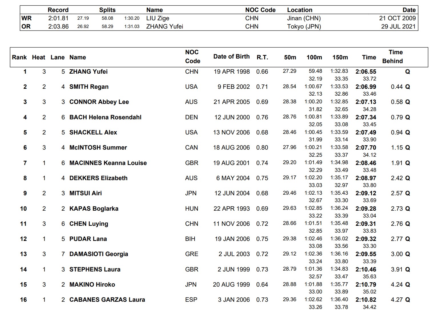 Racing in the third of three prelims, Zhang was one of two swimmers to break the 2:07 barrier during the morning session, as she posted a time of 2:06.55. That effort enabled Zhang to earn the top seed for the semifinals, ahead of the United States’ Regan Smith (2:06.99). Smith went to work about 14 hours after winning the silver medal in the 100 backstroke.