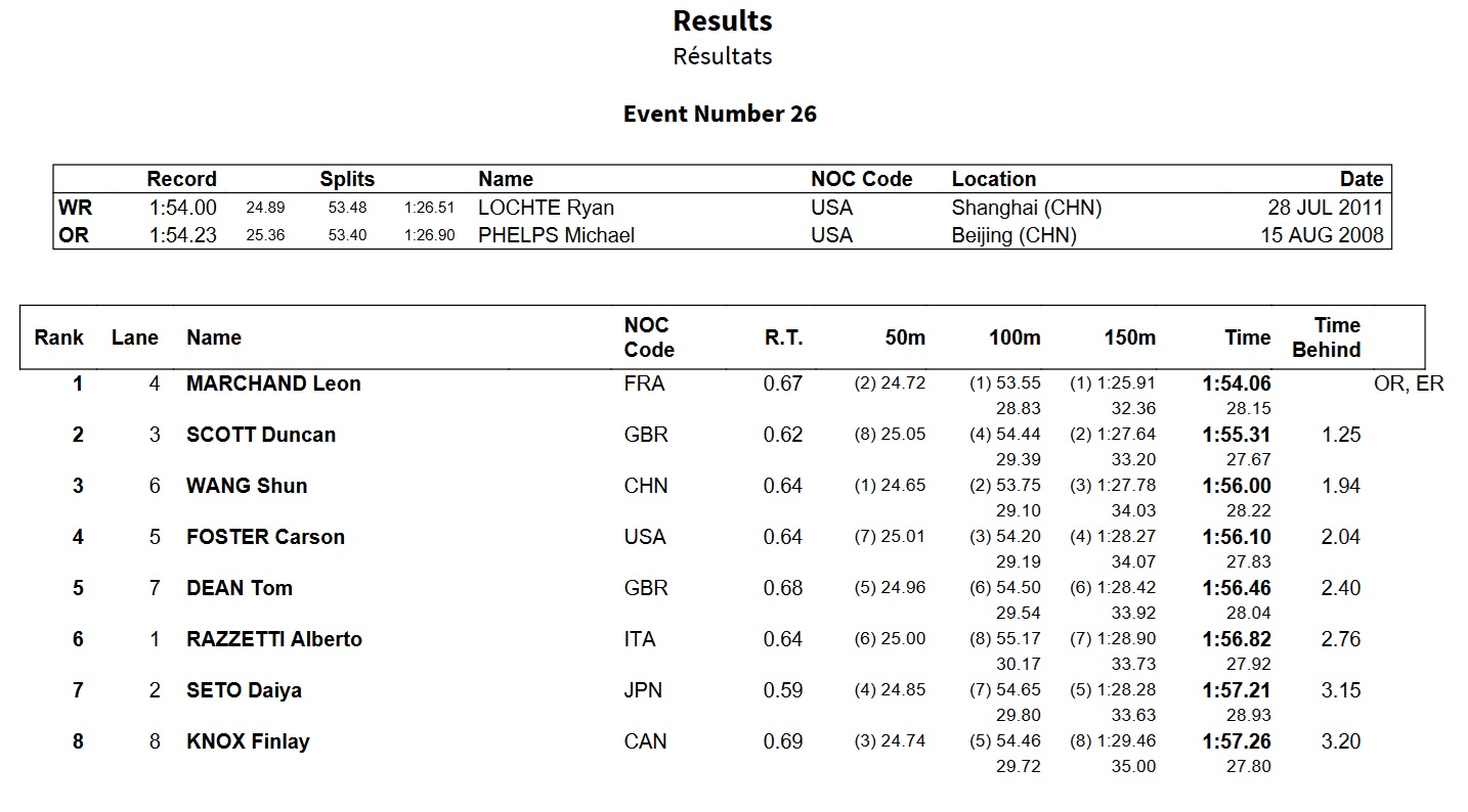 In the battle for silver, Scott pulled ahead of Wang with a 33.20 breaststroke split, almost a full second behind Marchand but second-best in the field, and Scott also had the top closing split as he finished in 1:55.31. That earned Scott his second consecutive Olympic silver in this event, his time only three hundredths slower than his personal best from Tokyo.