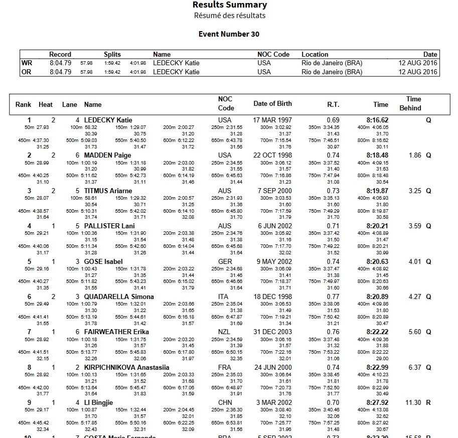 - Olympic record: Katie Ledecky, USA, 8:04.79 (2016)