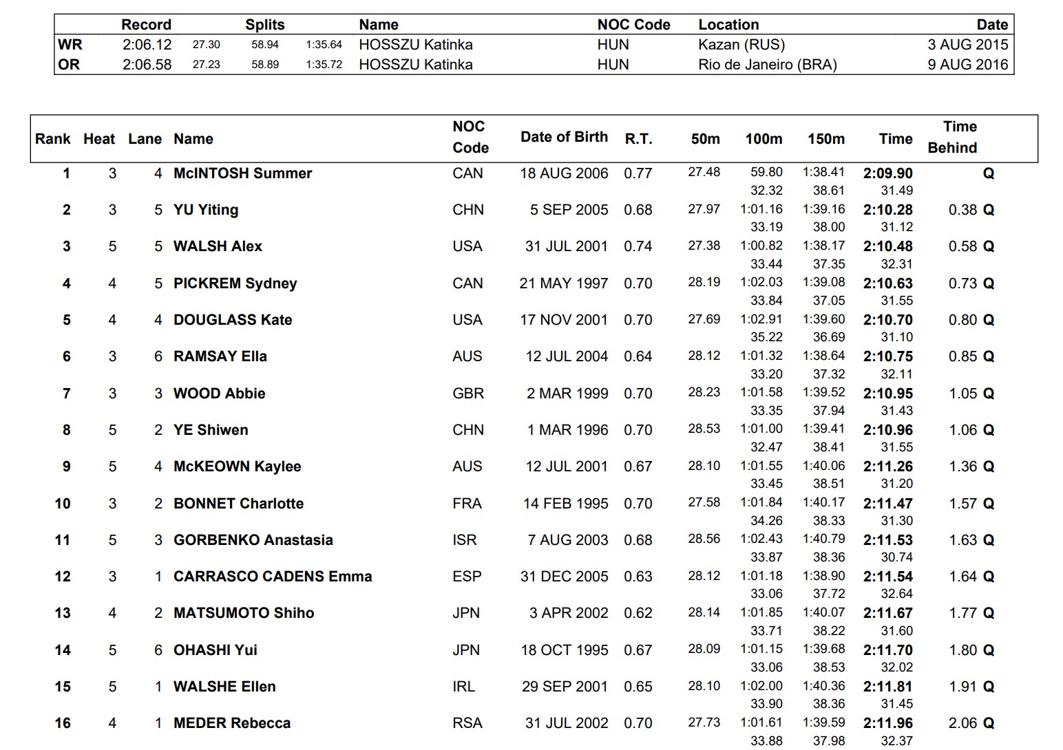 Reigning Olympic champion Yui Ohashi of Japan squeezed into the semifinals after finishing 14th in the morning. Ohashi touched the wall in 2:11.70.