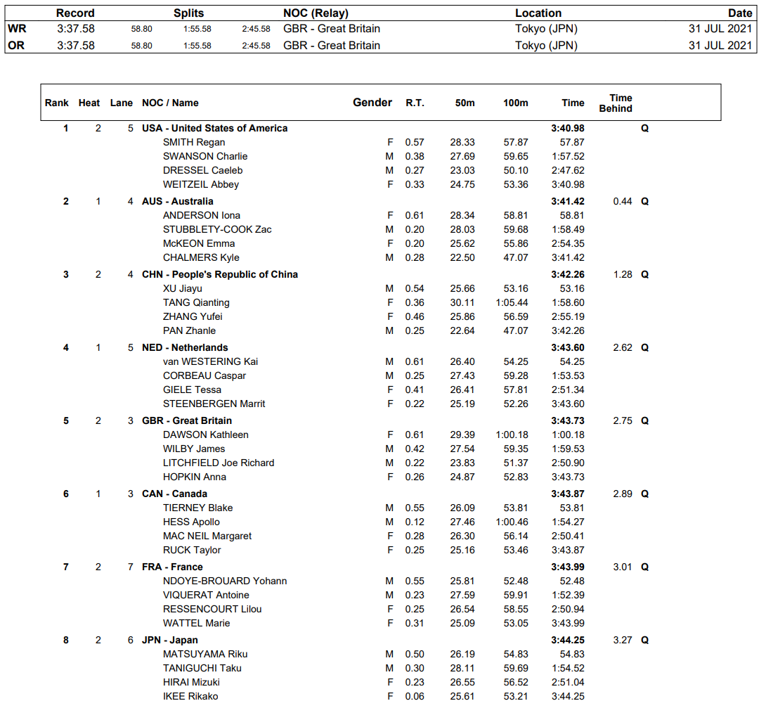 - Olympic Record: Great Britain (Dawson, Peaty, Guy, Hopkin) – 3:37.58 (2021)