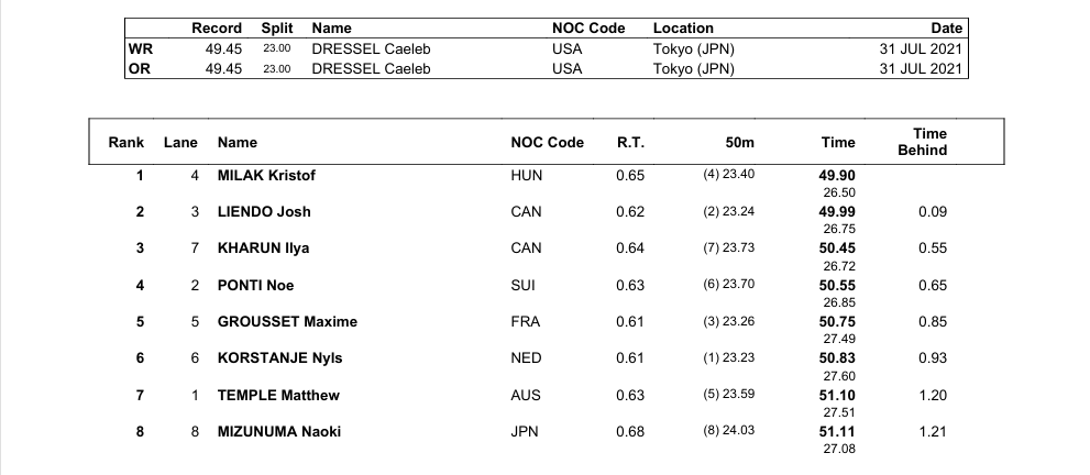 There was to be a new champion in the event with Caeleb Dressel, who set the 49.45 WR en-route to gold in Tokyo, 13th in prelims. Milak went second all-time that day with a European record of 49.68.
