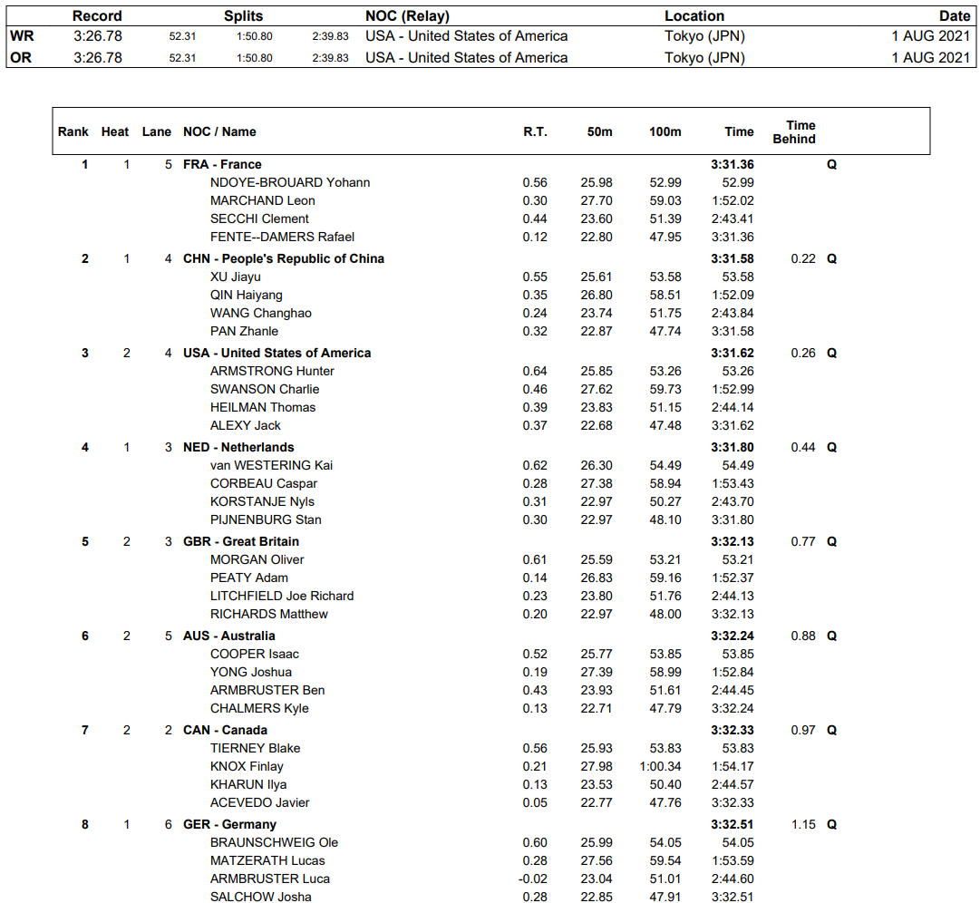 The Netherlands finished fourth overall in 3:31.80 thanks to sizzling middle splits from Caspar Corbeau (58.94 on breaststroke) and Nyls Korstanje (50.27 on butterfly), while Great Britain, with Adam Peaty returning from his bout with COVID to swim the breaststroke leg, placed fifth in 3:32.13. Australia got sixth in 3:32.24 with Kyle Chalmers anchoring in 47.79. Chalmers was the silver medalist in the 100 free, and he lifted his team to 400 free relay silver with his 46.59 anchor leg.