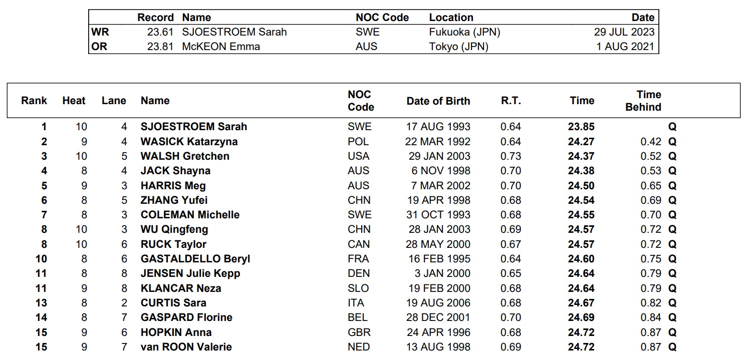 The overwhelming favorite to capture gold, Sjostrom blazed through the opening round of the 50 freestyle on Saturday morning at La Defense Arena in Paris. The world-record holder in the event, Sjostrom clocked a time of 23.85. That effort was comfortably clear of the 24.27 that was managed by Poland’s Kasia Wasick, who will be the No. 2 seed for the semifinals.