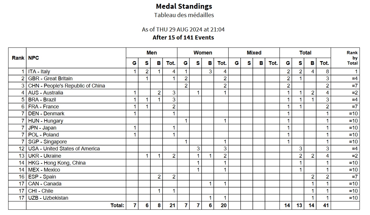 Italy is atop the medal table with eight total medals after one day. It joins China and Great Britain with two golds each. Australia and Ukraine have four medals apiece.