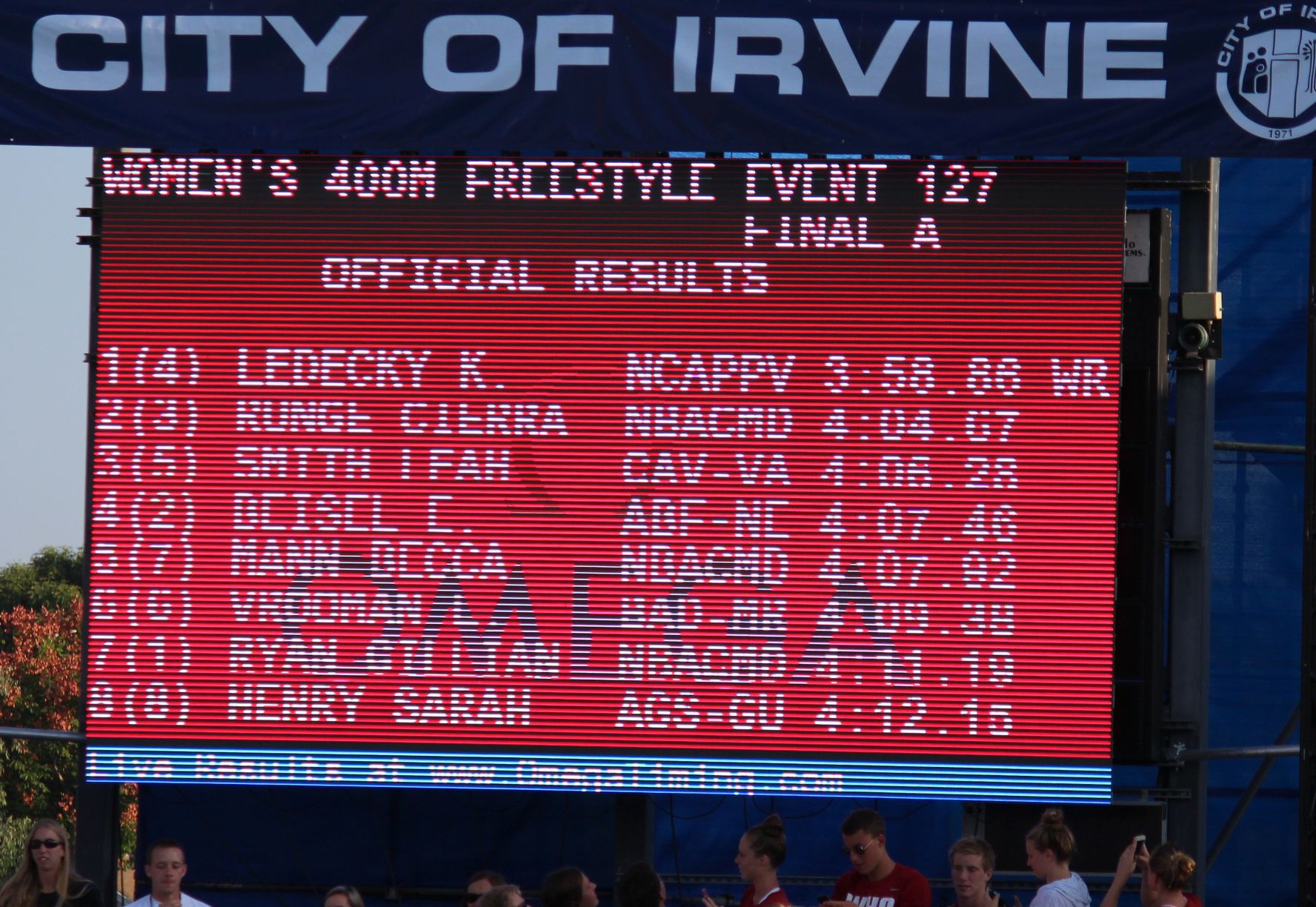 IRVINE, California, August 9. NCAP’s Katie Ledecky got the crowd going at the USA Swimming Senior Nationals as she blasted her way to a world record in the women’s 400-meter freestyle.