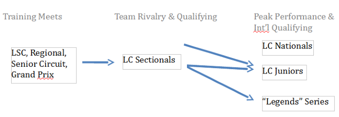 With strong committee leadership from Dave Ferris and great committee support from Paul Silver, Shawn Smith, John Morse and Kathleen Prindle, the Senior Committee developed a data-driven plan to fill in the “missing rung” and create a cohesive long course season around the country. Philosophically, the group’s proposal attempts to accomplish all three objectives. Ideally, the long course season would flow like this: