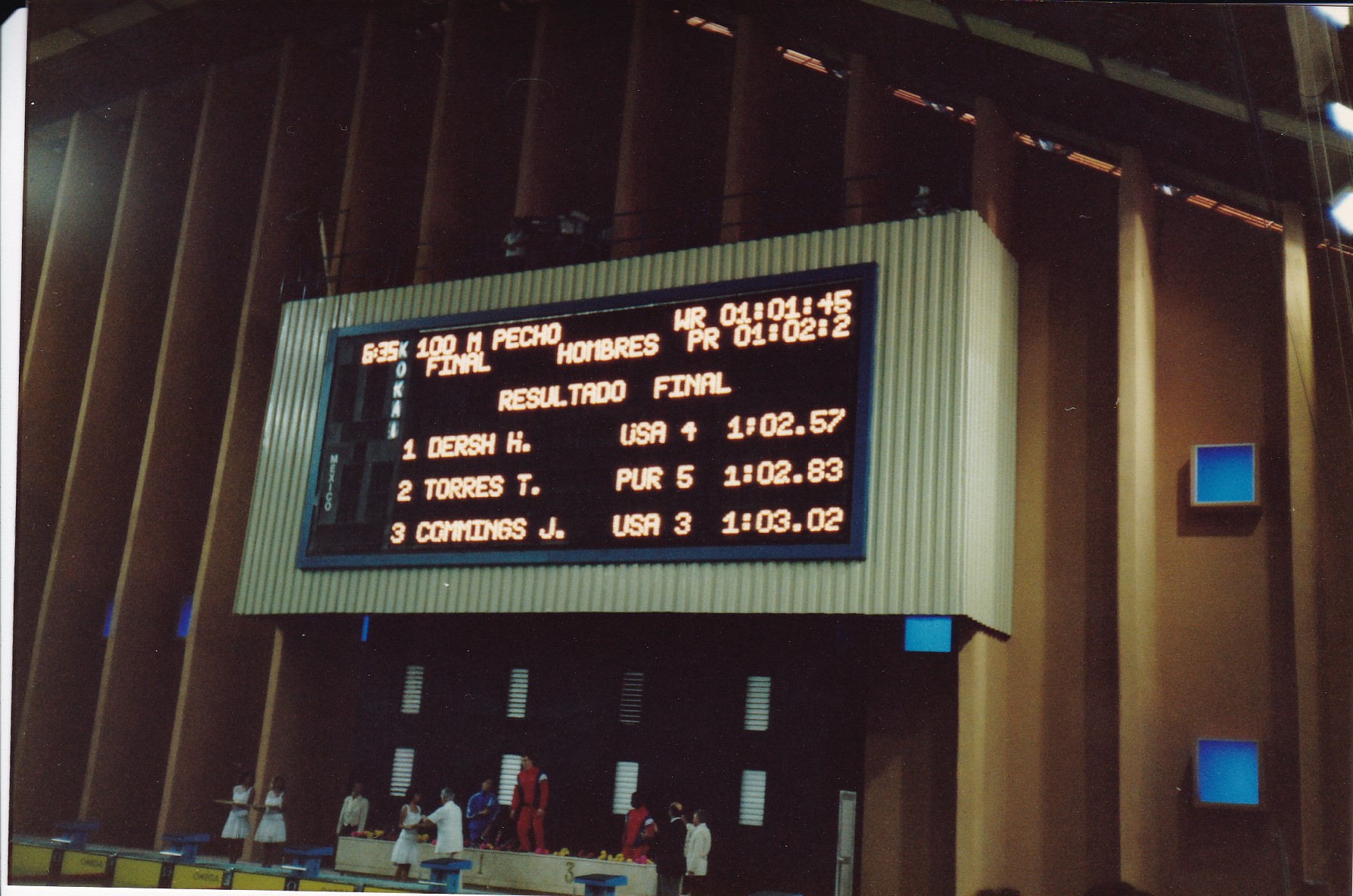 100 breast final at 1991 Pan American Games (Commings in third lane from top of screen)