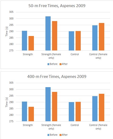 Now, this study appears positive for resistance training, but the swimmers were intermediate in speed, and the type of control training may have inhibited performance (causing overtraining). Moreover, only a 50-m was assessed, making gross assumptions of other events and distances unwarranted.