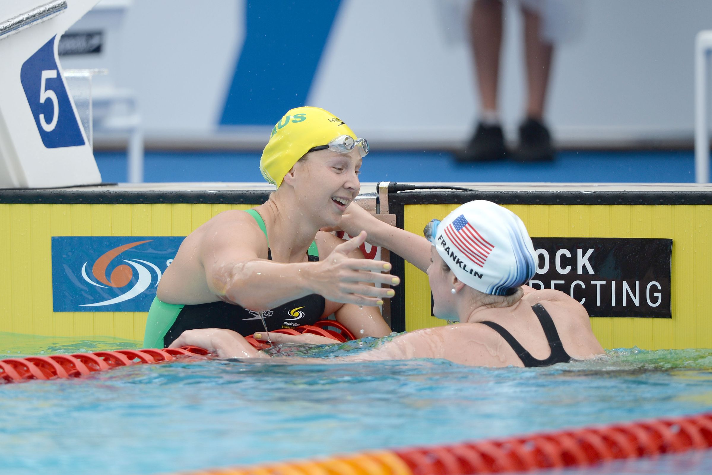 Australia’s Melanie Schlanger captured the first title on offer with a 53.51 at the finish, while Hungary’s Katinka Hosszu took second in the event with a 53.64.