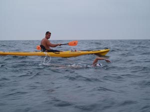 Previous statistics have shown that the ideal conditions for a swim across Lake Erie usually occur during the first week of August. Pyle set her sights on that time frame and was able to gather the support to make it happen. Her uncle, Mike Farrell of Bradford, Pa., was the captain of the lead boat which also carried Laura McIntosh, M.D., Saint Vincent Sports Medicine Physician. Her fiance, Brad Whitman, best friend, Tara Skasick and co-worker, Stacy Knapp, rotated in two kayaks which helped to guide Pyle through 3-5 foot waves, other boat traffic including three freighters and then darkness.