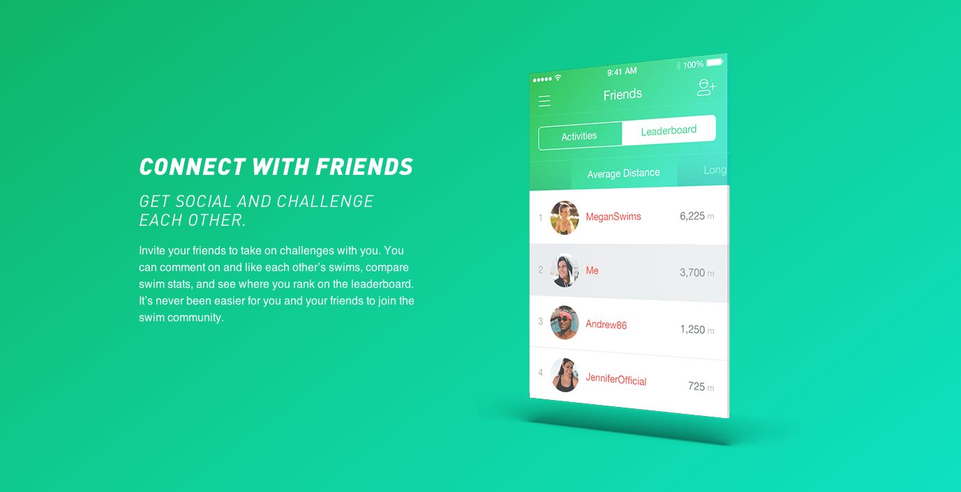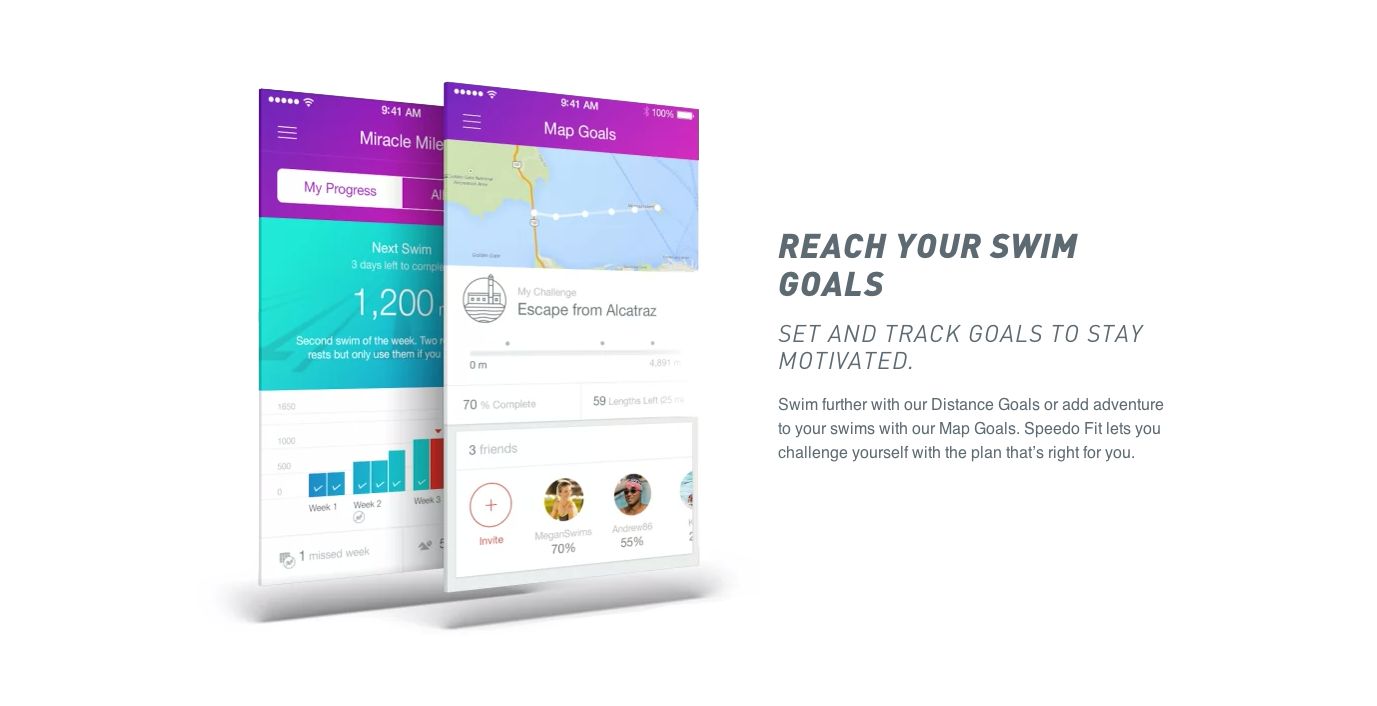 CONNECT WITH FRIENDS, by getting social. In addition to the interactive element of the Map Goals feature, Speedo Fit encourages users to comment and like each other’s swims, compare swim stats, and see who’s on the leaderboard. While some swimmers enjoy the solitary aspect of swimming, Speedo Fit makes it easy to join the swim community and to engage with other swimmers for support, recognition and motivation.