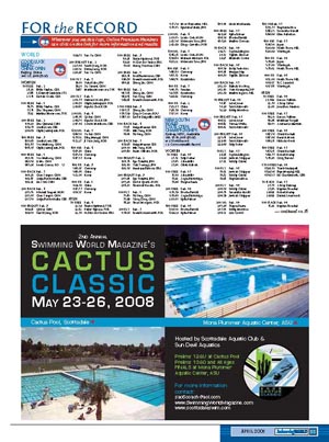 Results from a major USA competition, the Missouri Grand Prix, also appear in this month's For The Record section. This meet featured the likes of Katie Hoff, Michael Phelps, Natalie Coughlin and others.