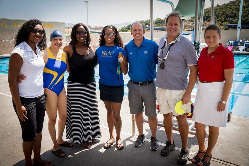 On Saturday, August 9th, the women of Sigma Gamma Rho Sorority, Incorporated, a traditionally black sorority, were treated with an exclusive clinic and extra special perks provided by AT&T in support of the Phillips 66 National Championship. Assembled as part of the Swim 1922 partnership between USA Swimming and Sigma Gamma Rho, the women participated in a swim clinic at the Northwood High School pool and were also given VIP tickets to finals on Saturday and Sunday of the Phillips 66 Nationals.