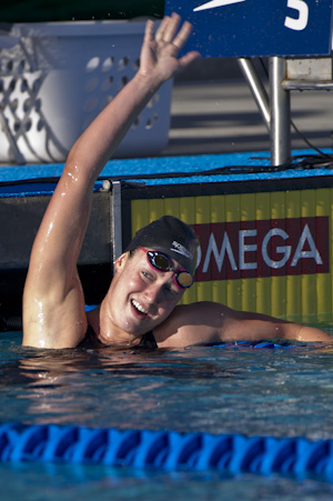 Vollmer claimed second overall with a 57.45 while swimming for California Aquatics. She just missed that season best of 57.39. SwimAtlanta's Kathleen Hersey took third in 58.15 to vault into sixth in the world rankings, while California's Natalie Coughlin wound up fourth in 58.31 for eighth in the world. Vollmer went out quick as well with a 26.92, while Coughlin was third at the turn with a 26.94.