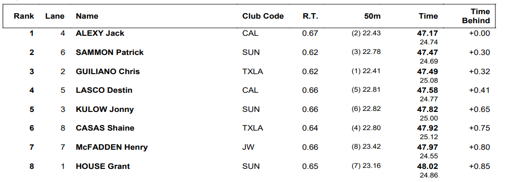 One hundredth behind Chris Guiliano at the halfway point, Alexy pulled clear of the field in the final 25 meters and left the race for second place. He clocked 47.17, just 18-hundredths off his morning time that ranks first in the world this year.