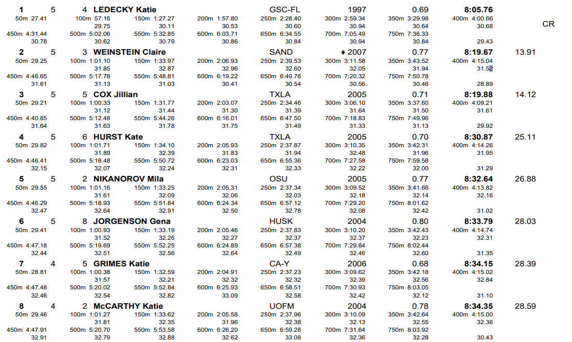 Weinstein was in third place and more than one-and-a-half seconds back of Cox with 100 meters remaining, but she closed in 59.35 to pull off the turnaround and secure the spot at Worlds. Weinstein touched in 8:19.67, two tenths ahead of Cox (8:19.88). Weinstein and Cox now rank fourth and fifth in the world this year, respectively, but Cox will have to wait until the 400 and 1500 free to try to earn her spot on the team.