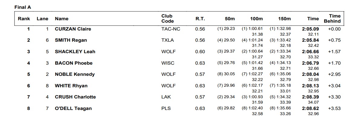Curzan continued to build and got to the wall in 2:05.09 completely a stellar race from Lane 1.