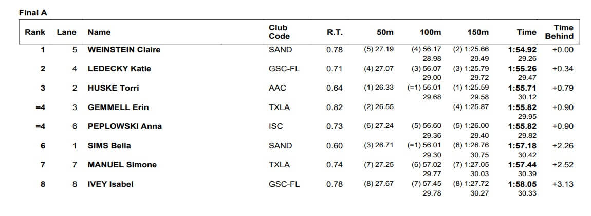 US Nationals Day 2 Finals: Claire Weinstein Chases Down Field to Win Women’s 200 Freestyle