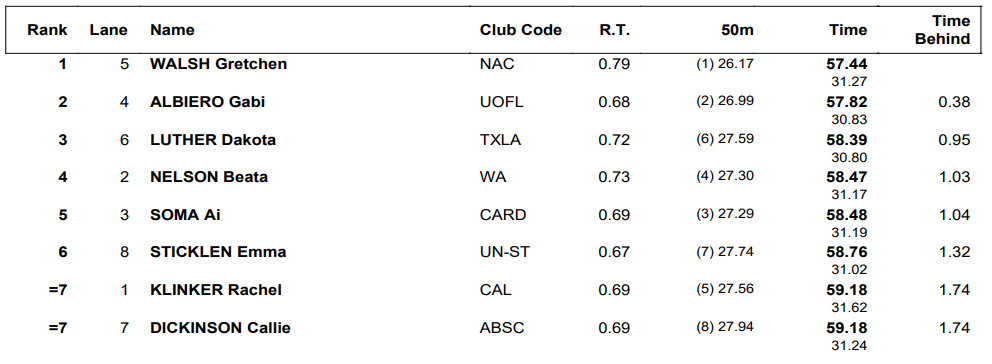 Albiero placed second in 57.82, knocking a tenth off the lifetime best she set in the prelims. Albiero will make her debut on a U.S. senior-level international team next month when she races at the Duel in the Pool. Third went to Longhorn’s Dakota Luther in 58.39, with Wisconsin’s Beata Nelson (58.47) and Cardinal’s Ai Soma (58.48) just behind Luther.