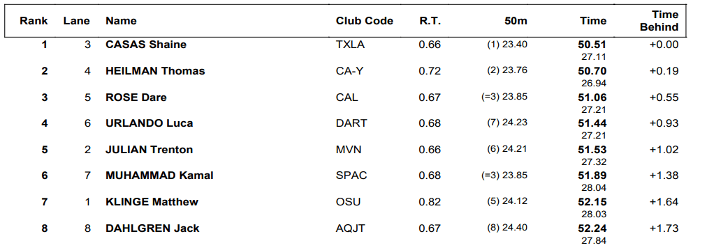 The 25-year-old would wait no longer to make his mark. Racing against Olympian Thomas Heilman and 2023 Worlds bronze medalist Dare Rose, Casas established an early lead and turned at the wall in 23.40, more than three tenths clear of the field. Both Heilman and Rose made pushes during the the second length, but they could not shake Casas. He hit the wall in 50.51, less than two tenths ahead of Heilman, with Rose fading to third.