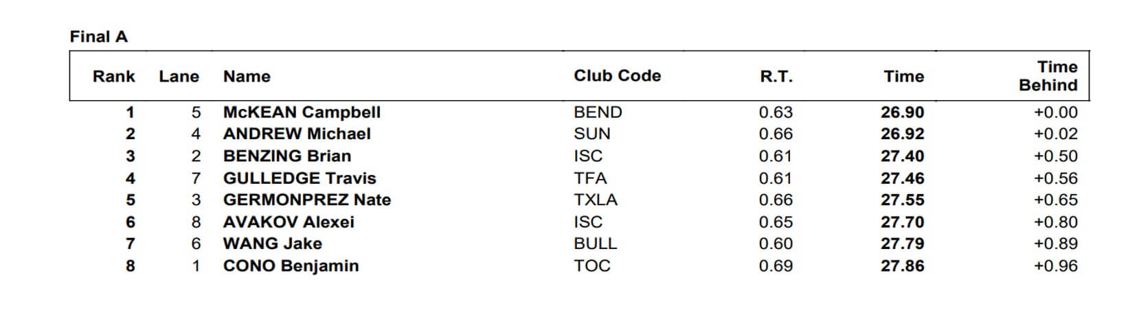 During the morning prelims, McKean and Andrew recorded matching times of 27.14. However, Andrew was still considered the favorite for the night session, based on his wide-ranging experience on the international stage. But in the final, the teenager was undaunted by the pressure-filled moment and came away with the biggest triumph of his career. McKean celebrated the win with a slap of the water.