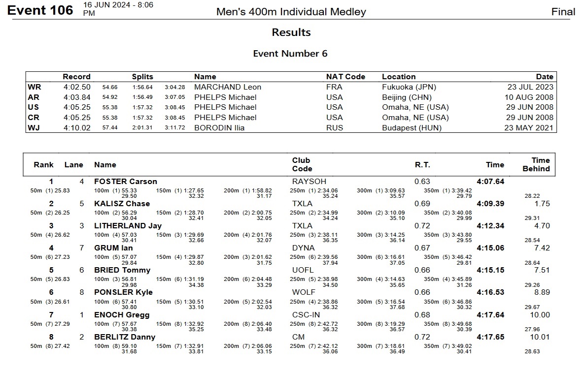 This time, Foster would make no such bobble, undeniable in his claim for a Paris place. The time is the fastest in the world this year, passing the 4:09.14 of Max Litchfield. Kalisz’s 4:09.39 slots into third.